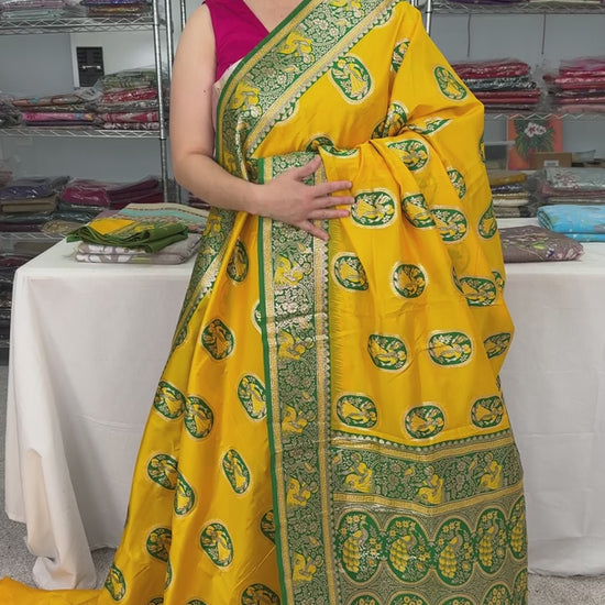 Discover the allure of Pratima, a Yellow and Green Baluchari Saree in Blended Silk, exclusively from Saree Mandi. This exquisite Bengali Saree from Bengal is perfect for weddings, cultural events, and the festive season. Crafted with meticulous attention to detail, its luxurious fabric and vibrant hues promise to make you the center of attention. Shop our exclusive collection with the added convenience of free fast shipping within the USA. Elevate your wardrobe with this timeless piece today.