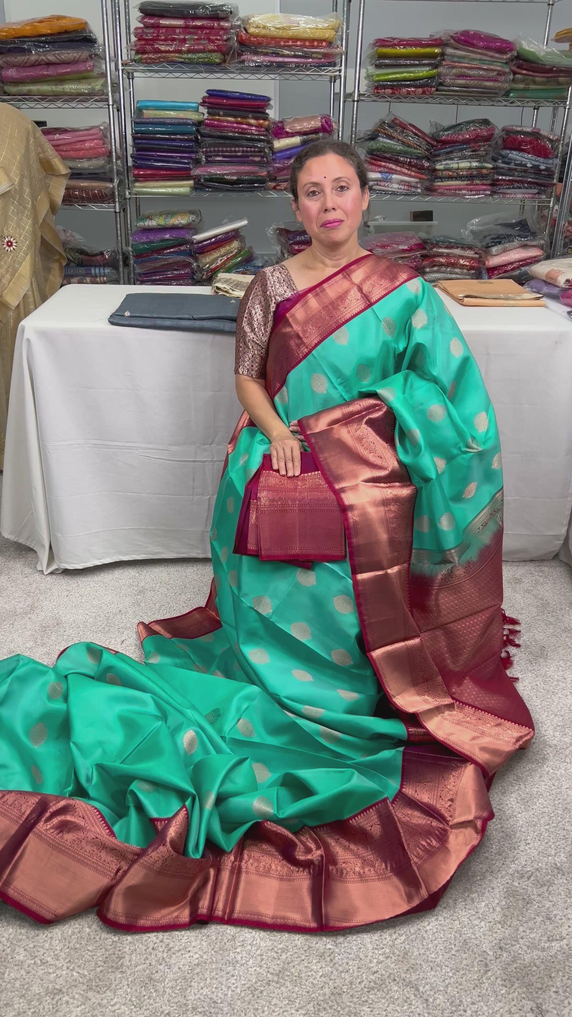 Kanjivaram Silk Saree in Rama Green and Maroon with Light Gold Zari